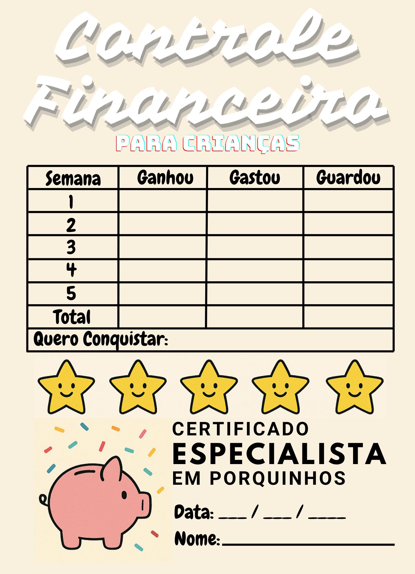Com a ajuda de um adulto, a cada semana, a criança deve anotar quanto ganhou, gastou e guardou e também escrever o que quer conquistar: um brinquedo, um livro, aquele jogo online, ajudar alguém… Cada vez que conseguir seguir direitinho o plano, ganha uma ⭐. Ao completar 4/5 estrelas, depende do mês, recebe o seu Certificado de Especialista em Porquinhos! 🎉
